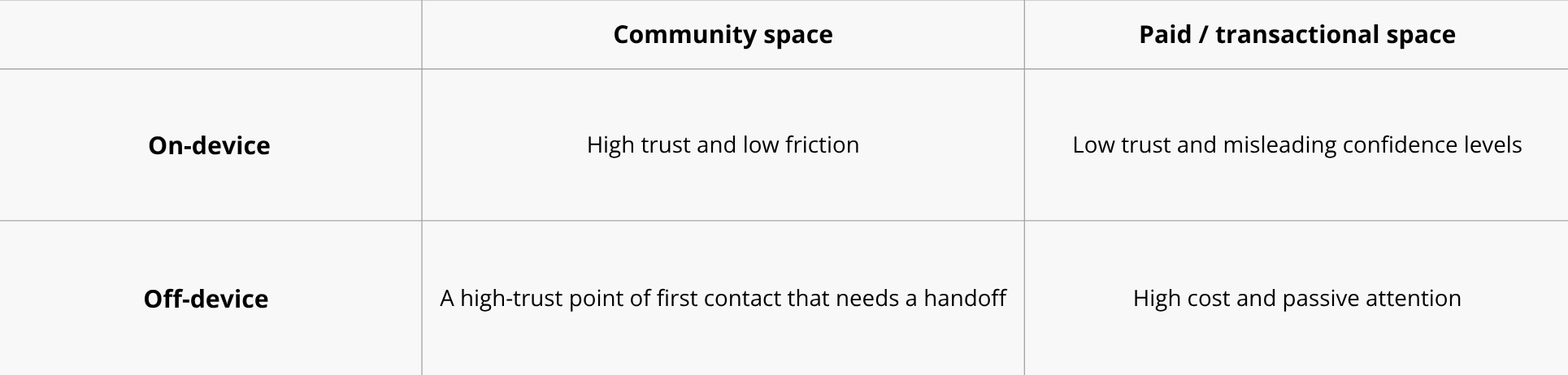 The two axes: on/off device and community/paid spaces