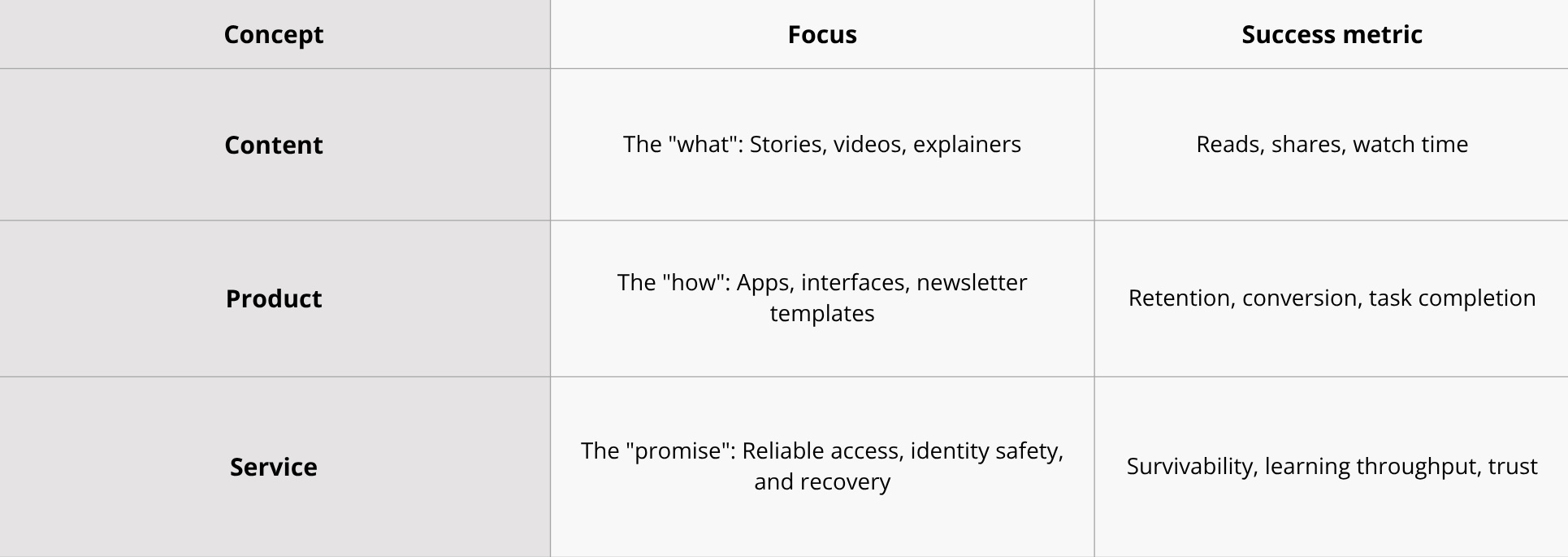 But in environments where information is a contested resource, the shipping lane framework is not only too simple but also assumes that the content is the product. In any information service worth running, the content is raw material, and the product is the interaction a reader has when the content arrives: what they understood, whether they trusted it, whether they could act on it, whether they shared it, and whether they came back.