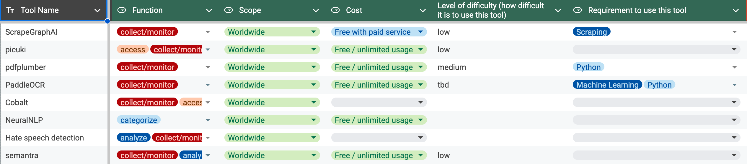 After identifying from our information map the sources we wanted to scrape, we assessed the technical requirements or challenges presented by each source, and what tools we would need to scrape its data.