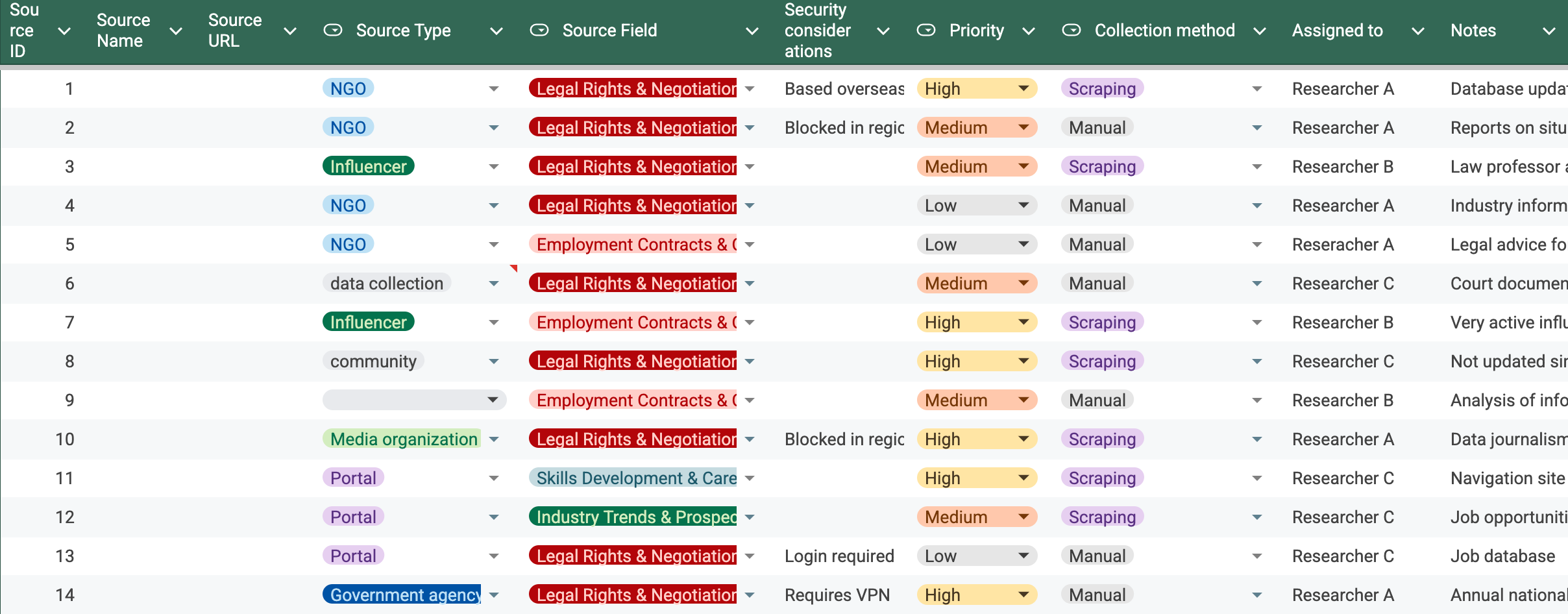 Before we collected the data, we documented in our information map this kind of broad information for going back later—or flagging a source that was not worth spending more time with because it was a low priority or duplicative information.
